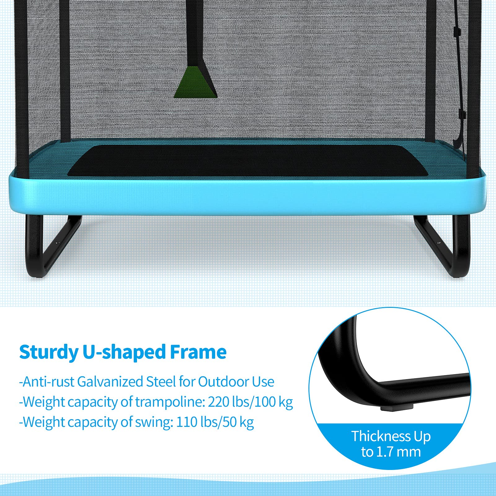 With high-density jumping cloth and 40 springs, this mini trampoline offers an excellent bouncing experience. After jumping, there is a safe swing for your child to play. Besides, the enclosure net, soft foam cushion, and upper pipes with foam padded to protect your kid from accidental injury. Additionally, this kid's toy holds up to 220 lbs for a trampoline and 110 lbs for a swing with the anti-rust galvanized steel frame with a U-shaped structure.